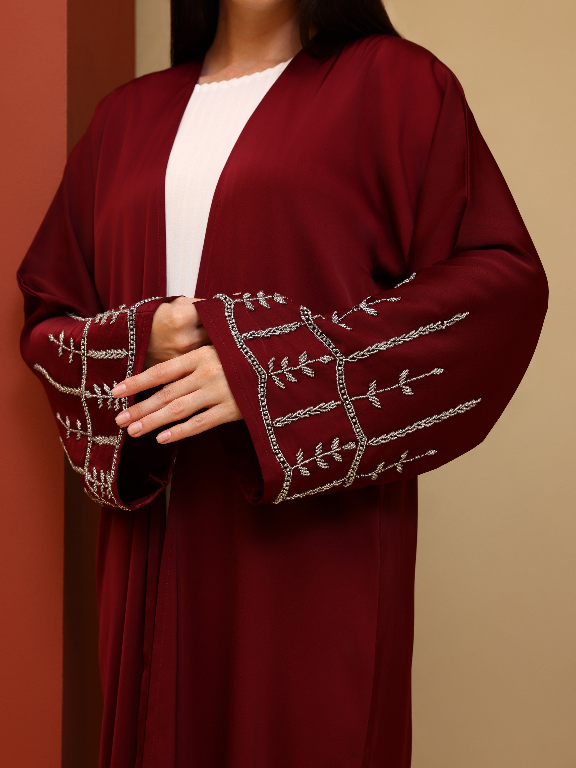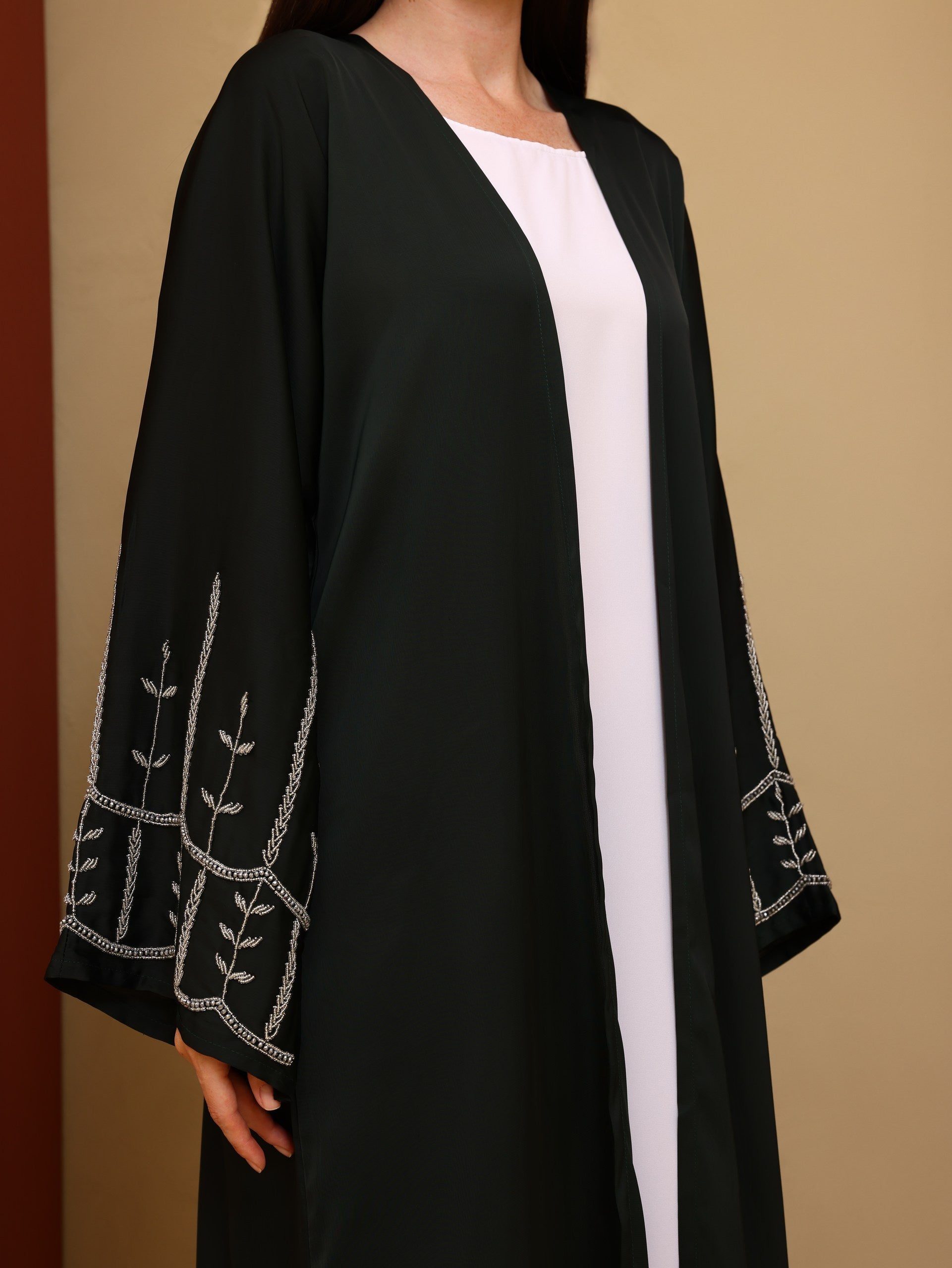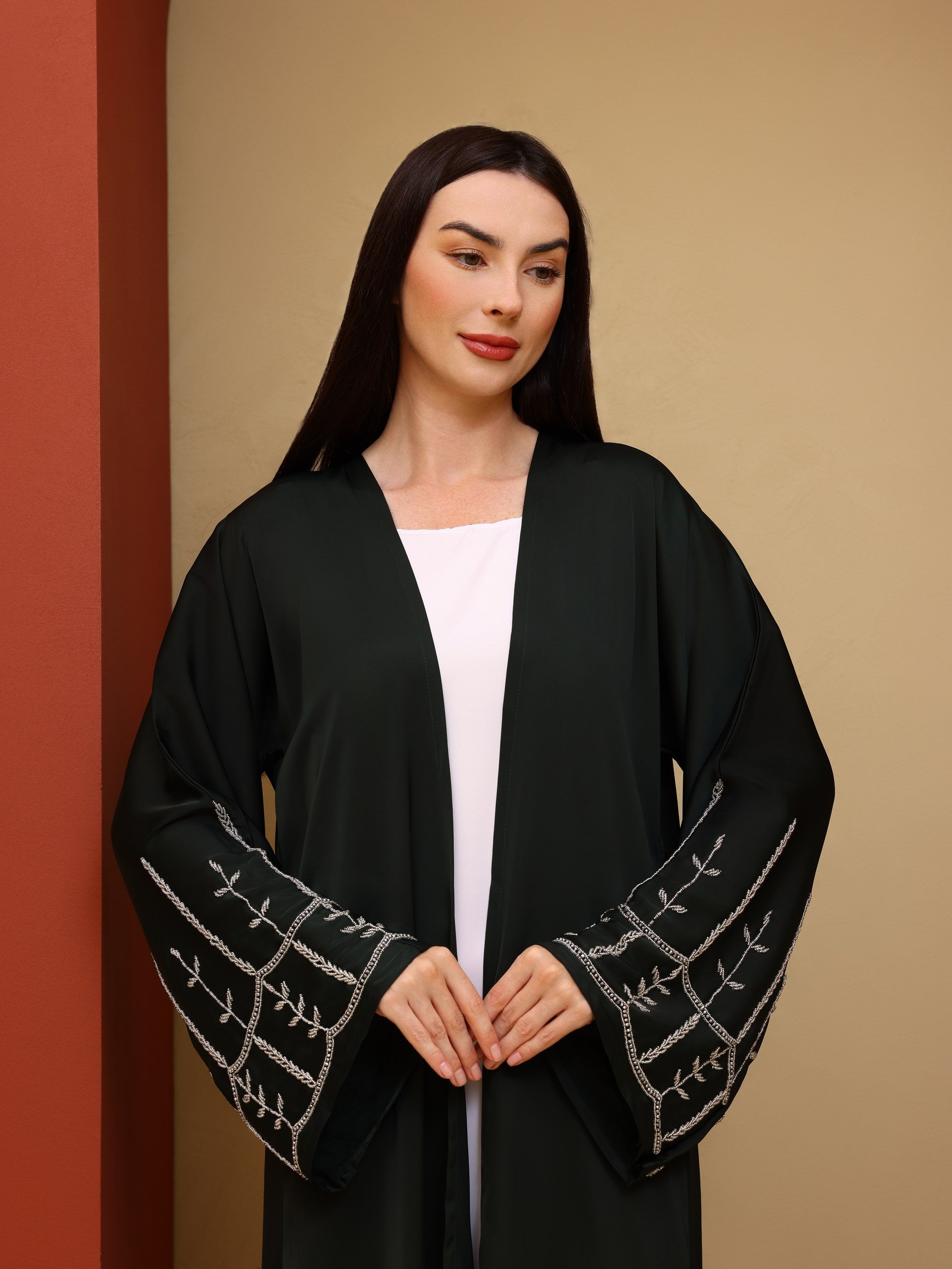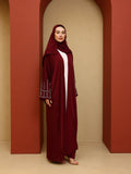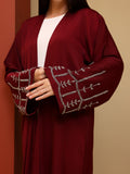 Crafted in a soft, fluid fabric, this abaya drapes effortlessly to create a graceful and elongated silhouette. The design is enhanced with delicate embroidery on the sleeves, adding a subtle yet distinctive detail that reflects timeless sophistication.