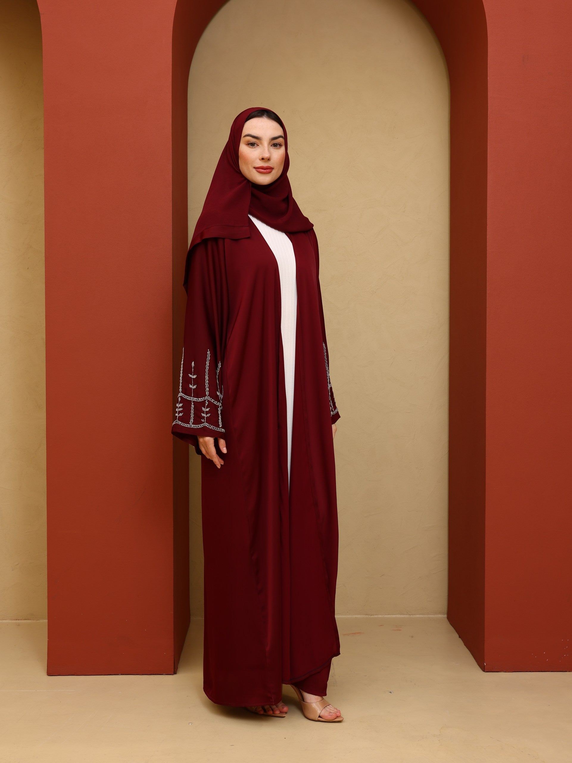 The Arielle Abaya comes as set, including a abaya, coordinating hijab, and a belt, allowing you to style it your way. Wear it open for a relaxed look or cinch the waist for a more defined and feminine silhouette.
