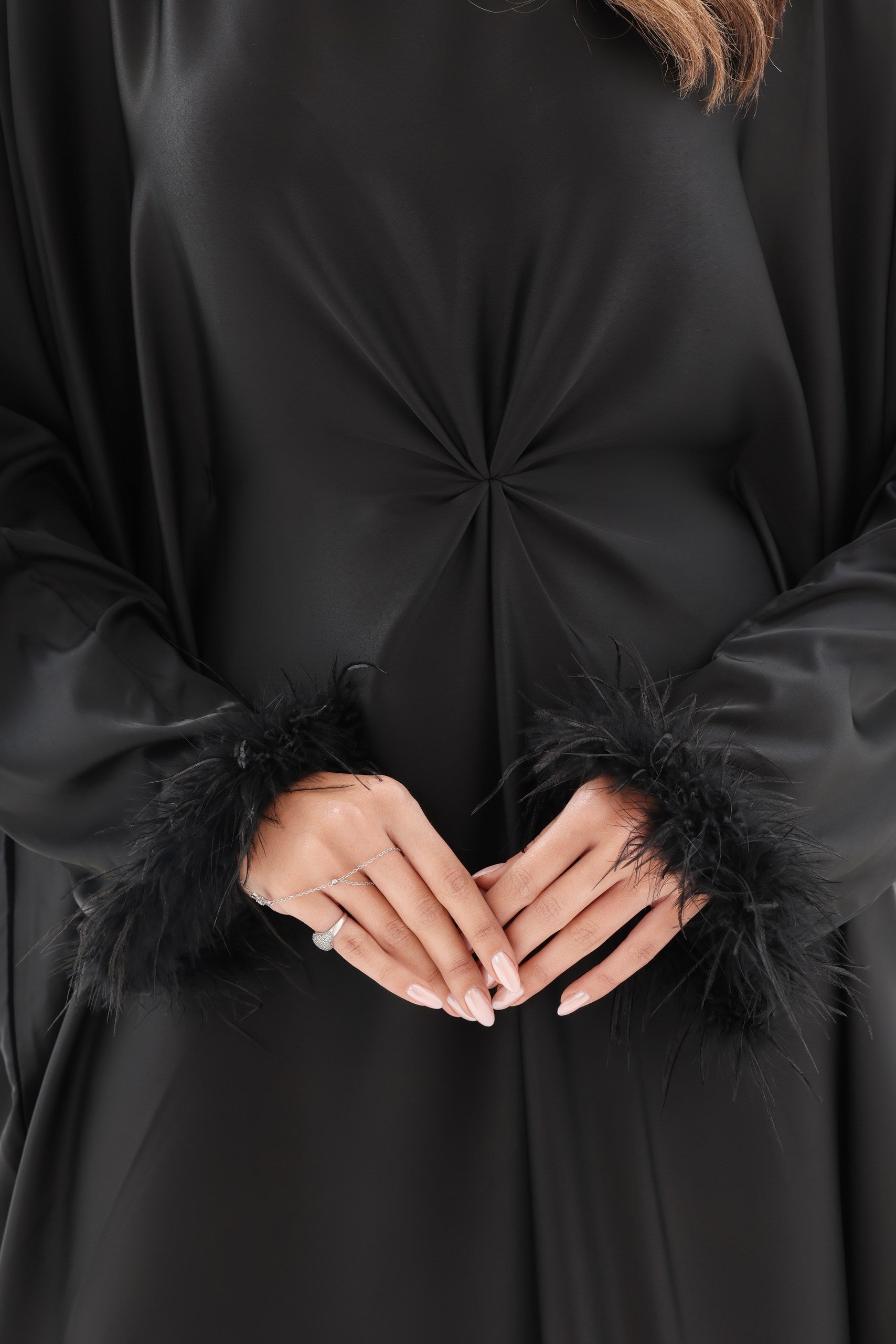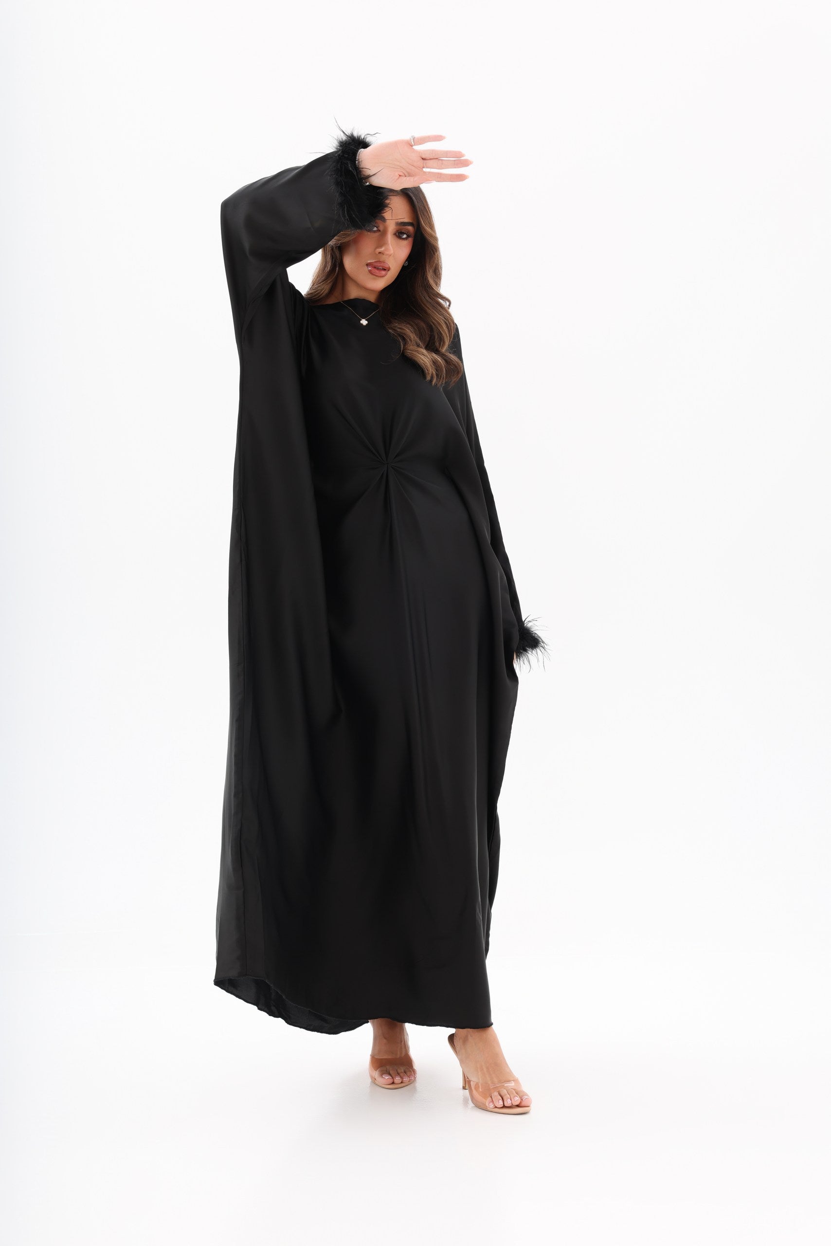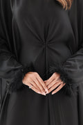 Ayla Feather Abaya with concealed waist belt and feather sleeves. Premium luxury modest wear Dubai.