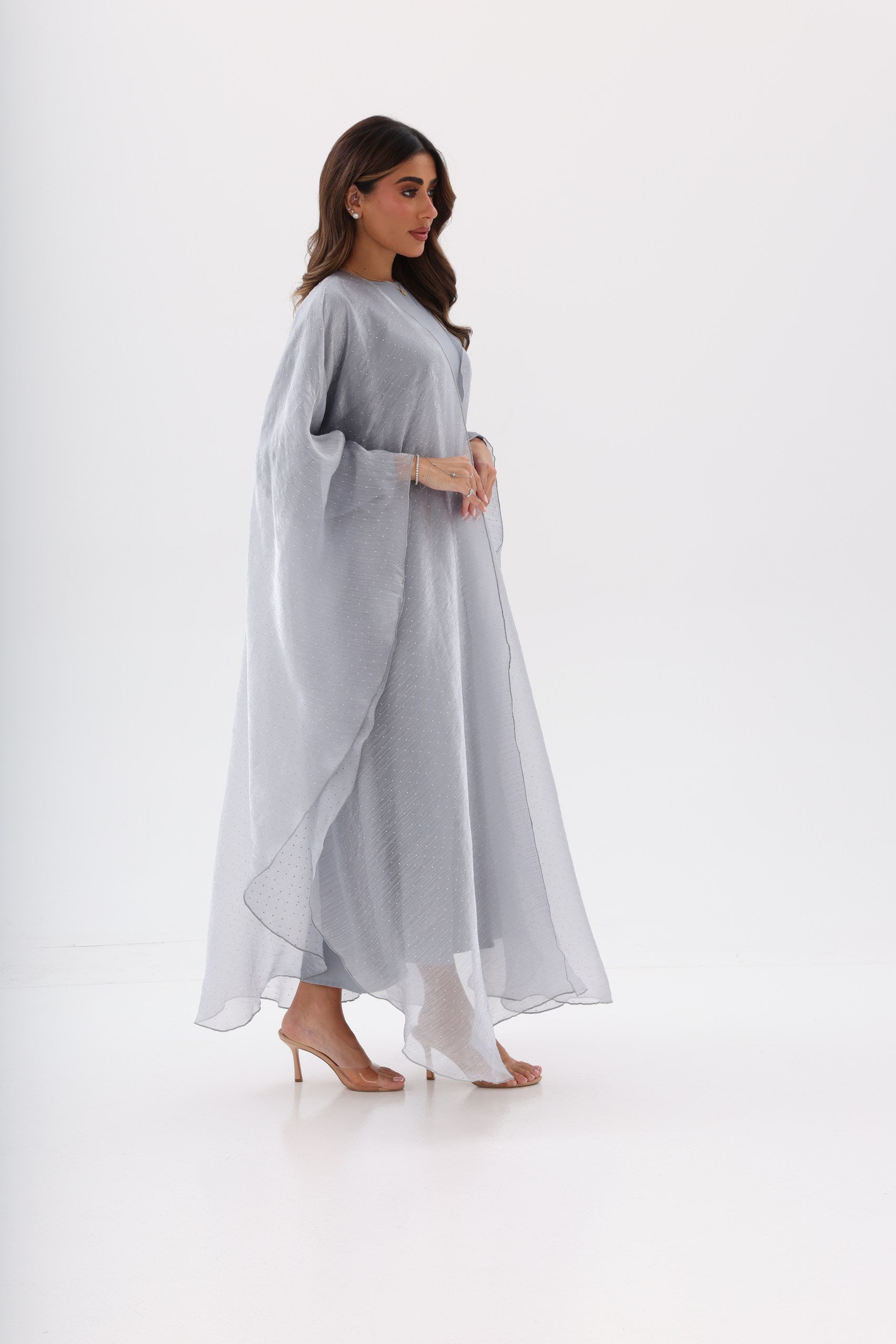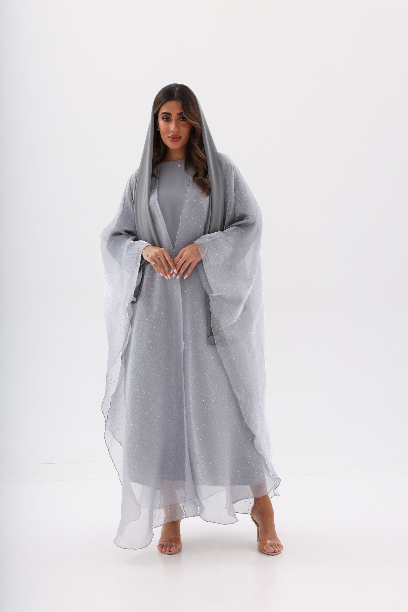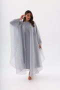 Layla Abaya is a graceful embodiment of evening elegance. Crafted in a soft Silver Mist shade, this abaya features a flowing silhouette with a sheer, subtly textured outer layer that drapes effortlessly around the body. The delicate fabric catches the light with understated shimmer, creating a refined and ethereal look. Designed for special evenings and elegant occasions, this piece includes a matching hijab to complete the look with timeless sophistication.