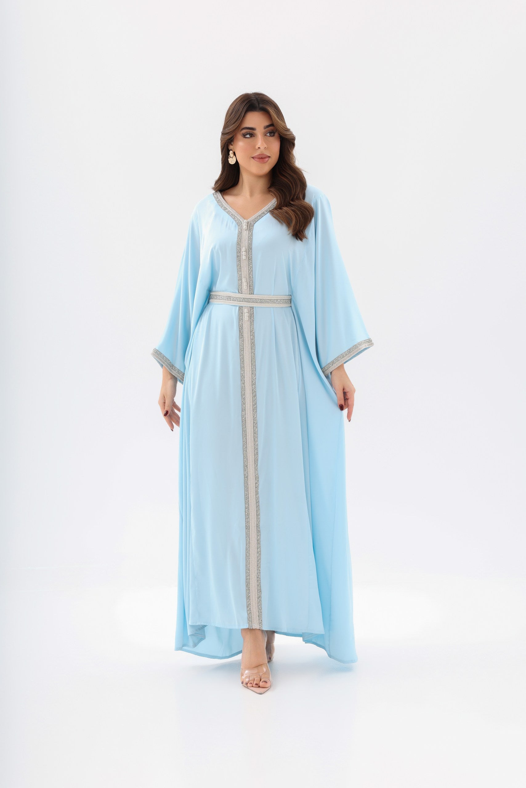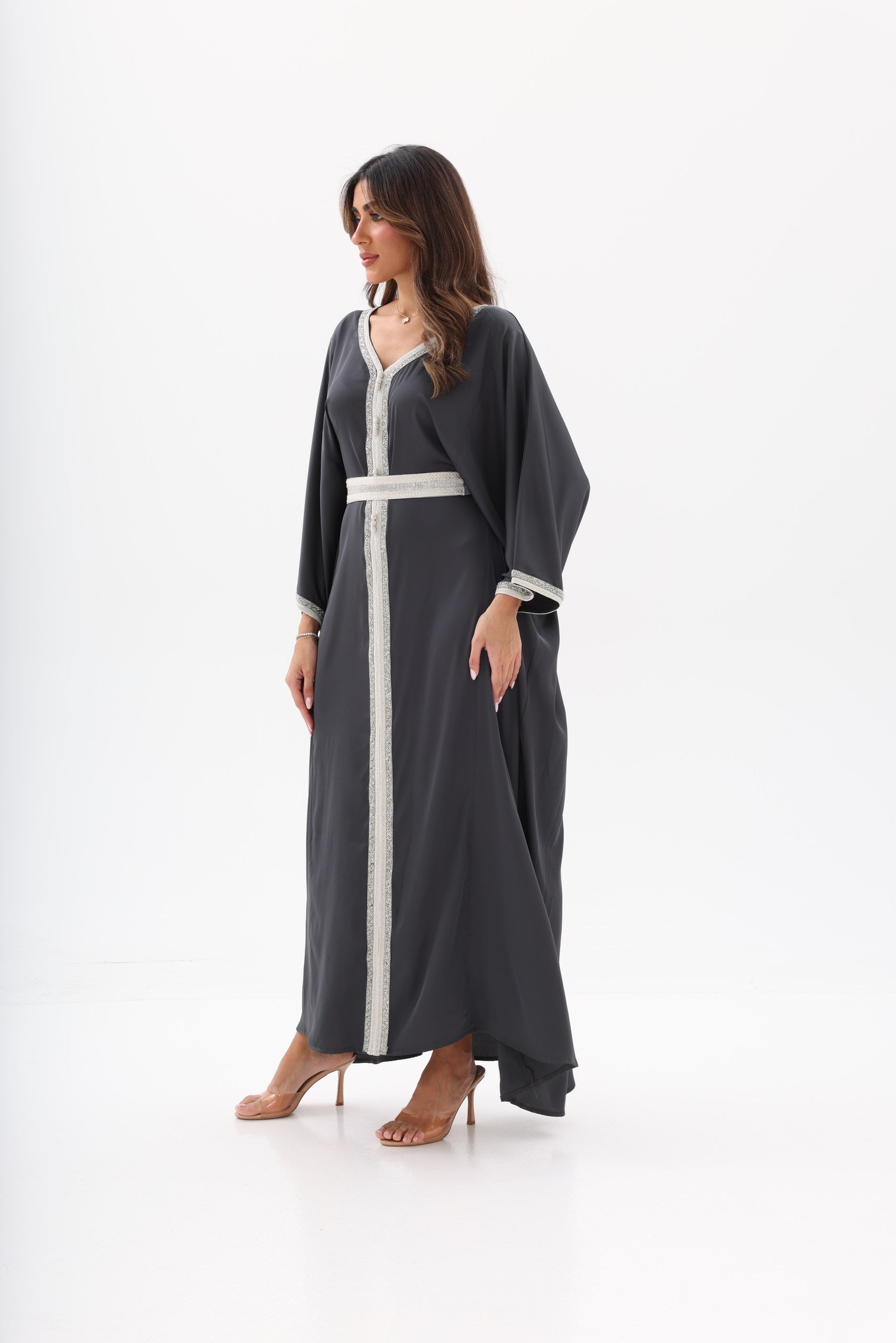 The MAHRA Abaya is a refined open-front abaya designed for effortless elegance and modern modest wear. Crafted from a flowing, premium fabric, this piece drapes beautifully while maintaining a soft and feminine silhouette. An adjustable belt allows you to define the waist or wear the abaya loose for a more relaxed look. Subtle decorative detailing adds an understated touch of luxury, making this abaya perfect for elegant gatherings, evening occasions, or elevated everyday wear.